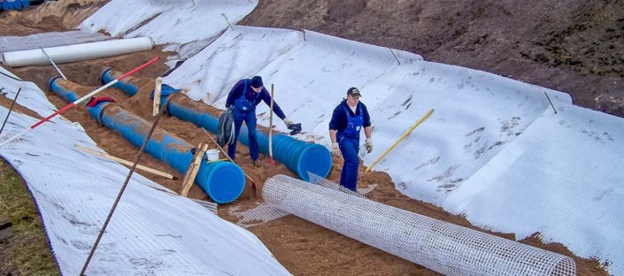 Дренажные геокомпозиты, нетканые геотекстиль и геомембраны используются для сбора осадков, грунтовых вод или другой воды и газа в дренажные системы. Эти продукты предназначены для установки плоского, горизонтального или вертикального дренажного слоя в грунте или других строительных конструкциях.